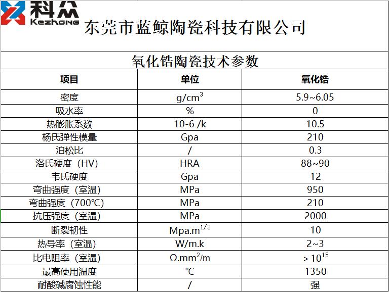 釔穩定氧化鋯陶瓷技術參數